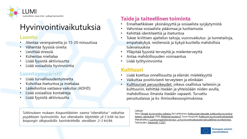 Luonnolla, taiteella ja kulttuurilla on tutkimuksissa todettu olevan monenlaisia positiivisia vaikutuksia fyysiseen ja mielenterveyteen, mielen hyvinvointiin sekä koettuun hyvinvointiin, elämänlaatuun ja onnellisuuteen.