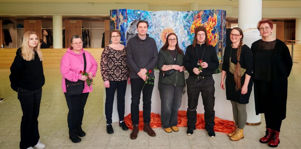 LUMI-ohjaaja Pauliina Hyytinen toivotti tervetulleiksi vieraat ja yhteisötaideteoksen tekijät: Minja, Katja, Matti, Marjut, Niina, Onni, Piia, Taru ja Niina. Teos paljastettiin ja LUMI-ohjaaja Viivi Törmänen kertoi sen syntytarinan.