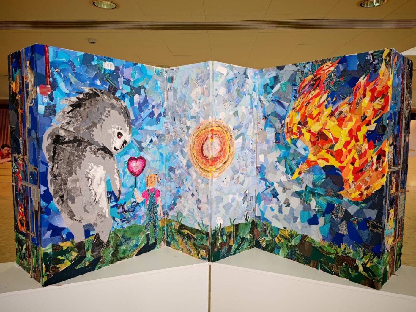 ”Teos on kollaasitekniikalla toteutettu teos vaneripohjalle ja se on koostettu kokonaan kierrätysmateriaaleista. Tekniikka oli uusi tuttavuus ainakin suurimmalle osalle taiteilijoista, mutta oli ilo nähdä, miten innokkaasti ja ennakkoluulottomasti ryhmä otti haasteen vastaan. Työ näytti tempaavan mukaansa heti alusta asti ja itse työskentely koettiin mielekkääksi ja kiinnostavaksi. Oli myös kiva huomata, miten ryhmästä löytyi uusia ratkaisuja ja ideoita, niin aihemaailman kuin toteutuksen suhteen. Työskentely poiki myös ideoita taiteilijoiden uusiin omiin projekteihin vastaavalla tekniikalla.