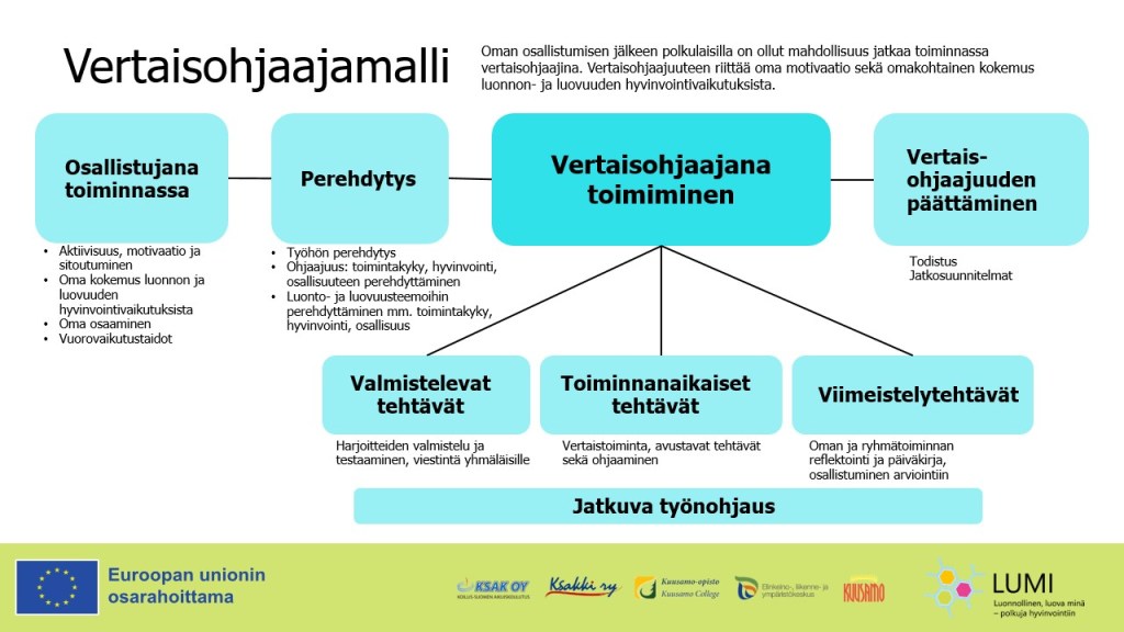 LUMI-hankkeessa vertaisohjaajamallia testattiin käytännön ryhmissä. Palkatut vertaisohjaajat osallistuivat aktiivisesti mallin kehittämiseen, ja toimintamalli todettiin toimivaksi.
